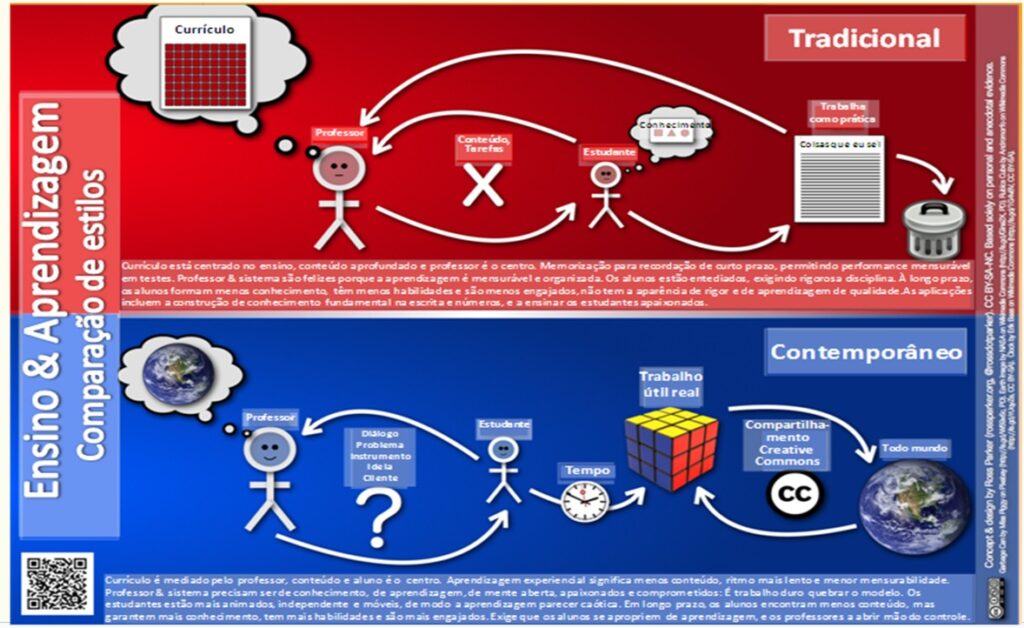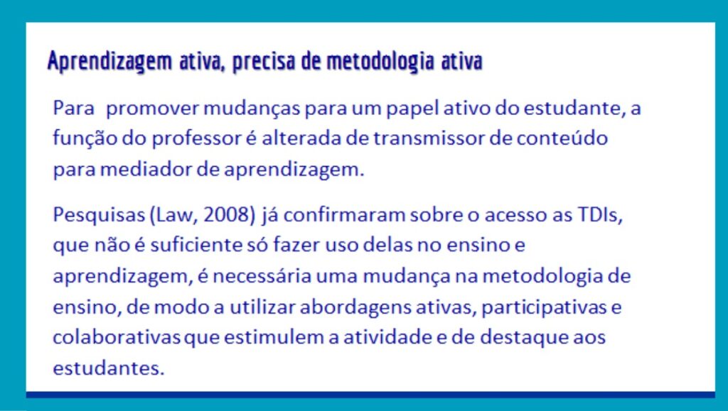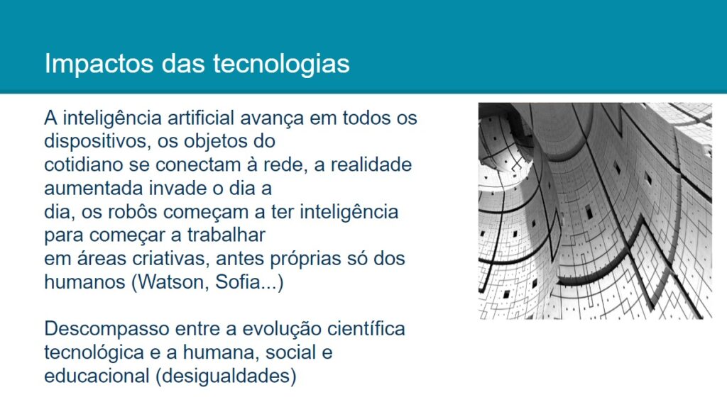“Ao mesmo tempo, há uma nova percepção de que se aceleram as mudanças em todos os campos da vida e, especificamente, na educação, há uma pressão para que as escolas sejam mais interessantes, que a aprendizagem seja mais ativa, criativa, flexível e diversificada, com apoio de tecnologias cada vez mais avançadas.”